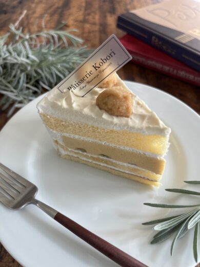 フワフワしっとりのスポンジに、刻んだ栗の甘露煮とマナクリームをサンドし、マロンペーストを合わせました。