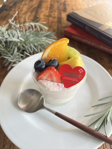 フロマージュブランのムースにラズベリーソースを合わせフルーツを飾りました。